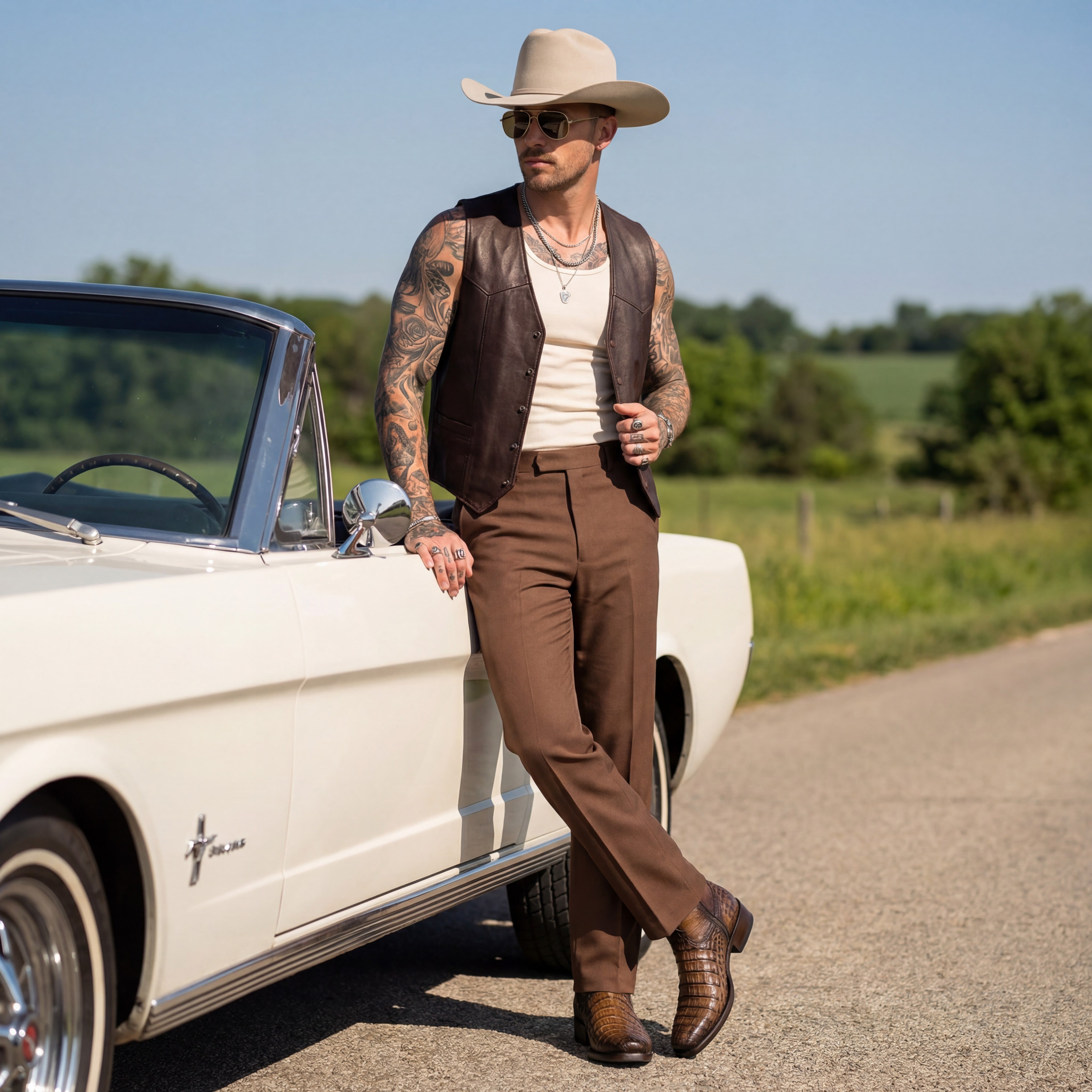 Men's Leather Alligator Tail Print Square Toe Western Cowboy Boot