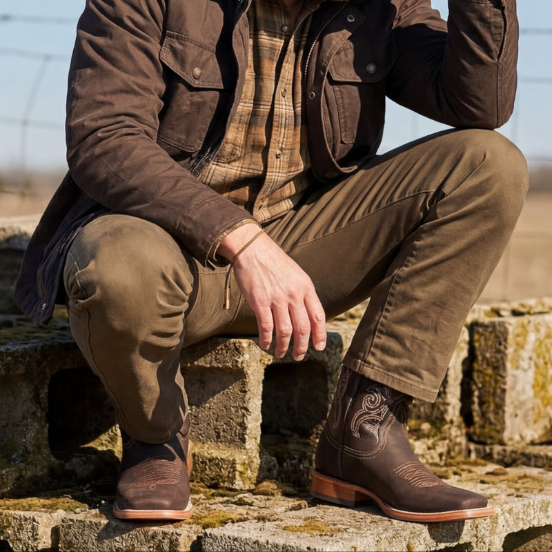 Men’s Genuine Leather Square Toe Pull-On Cowboy Boots – Brown Mid-Calf Western Riding & Ranch Boot