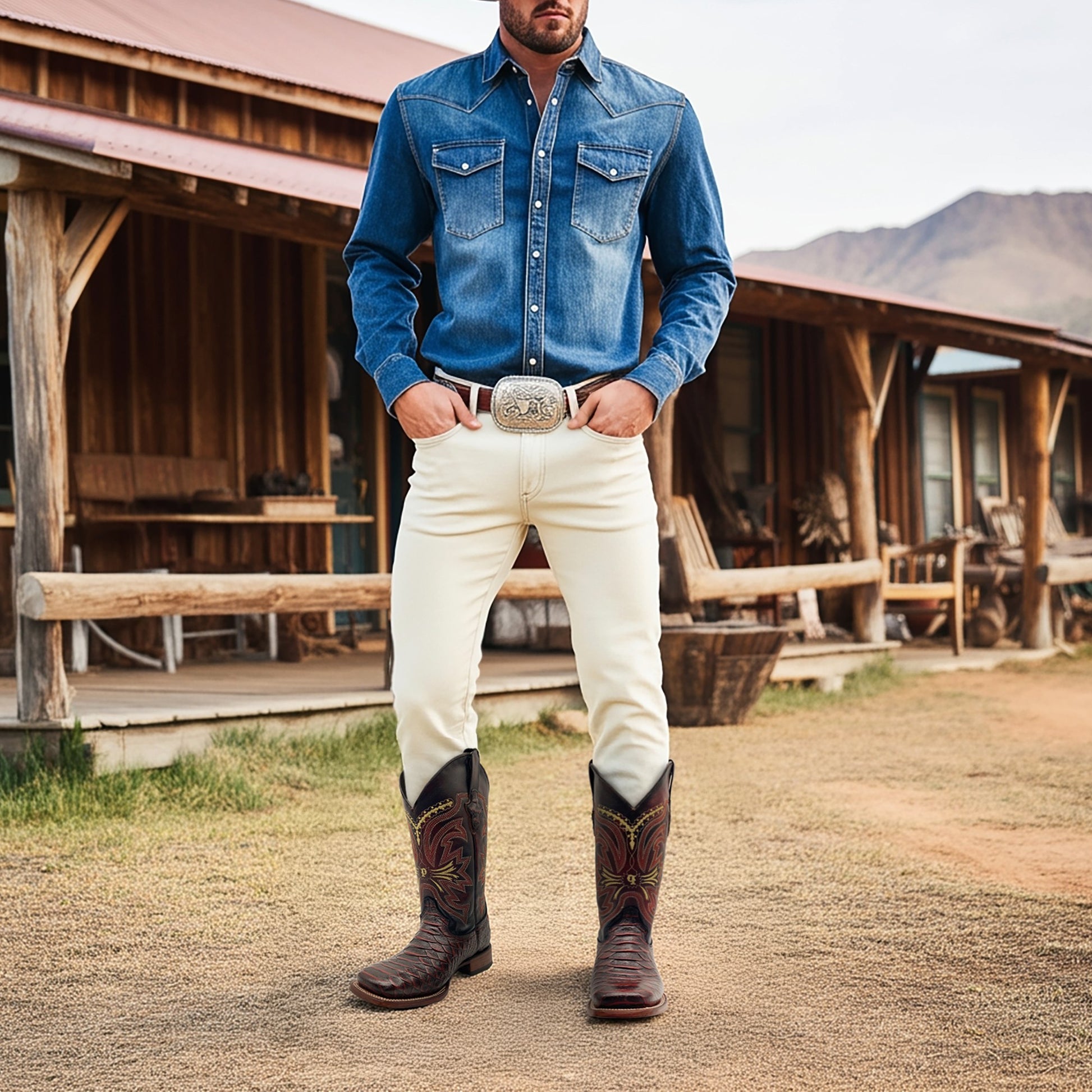 - DESIGN: Men’s Leather Cowboy Western Boot | Embossed Python Print | Embroidered Shaft | Midcalf | Square Toe