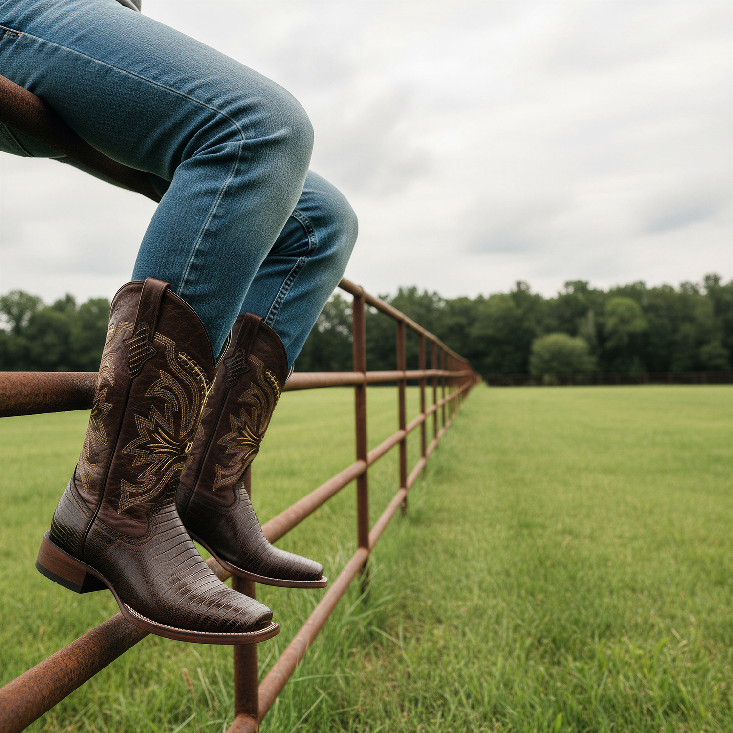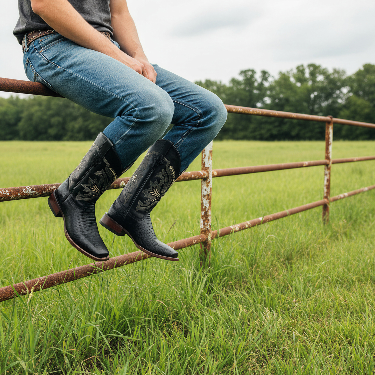 - DESIGN: Men’s Leather Cowboy Western Boot | Embossed Lizard Print Vamp| Embroidered Shaft | Midcalf | Square Toe
