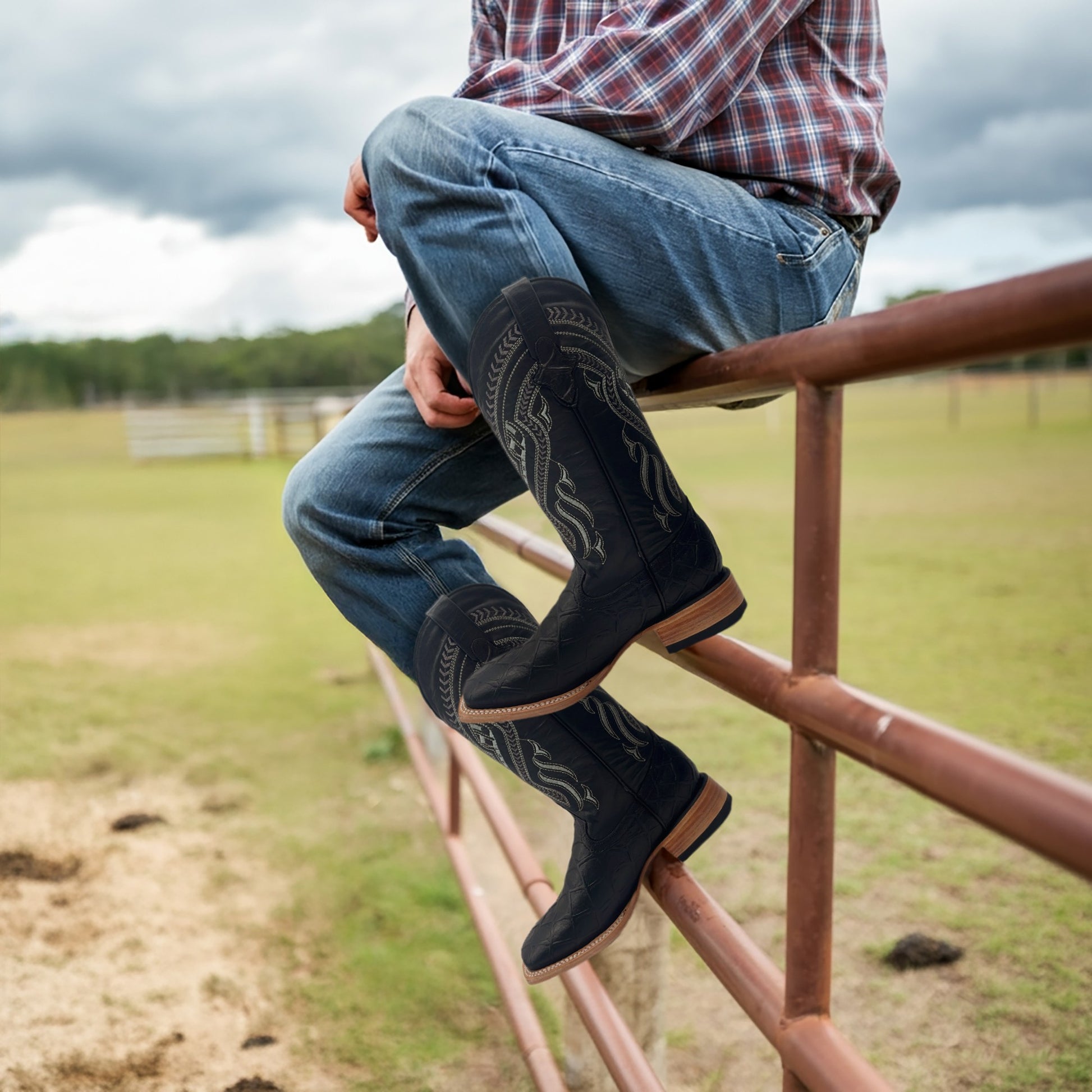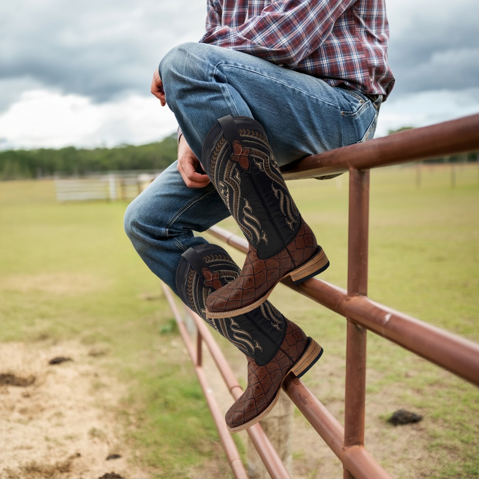 - DESIGN: Men’s Leather Exotic Fish Print Western Boot |Embroidered Shaft | Midcalf | Square Toe