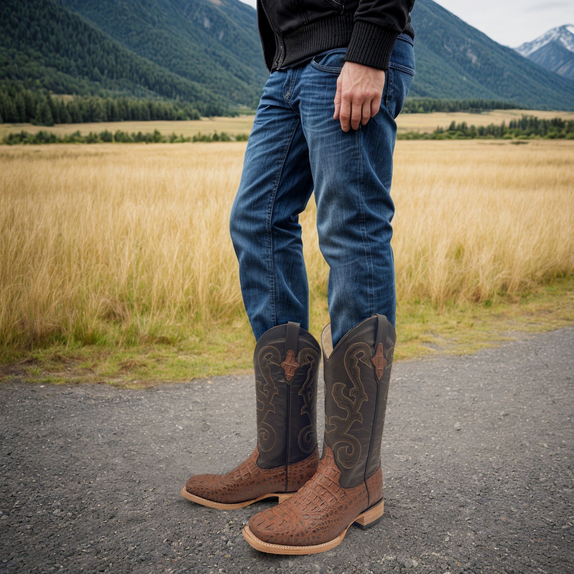 Men’s Leather Cowboy Boot Square Toe Embossed Alligator Crocodile Print