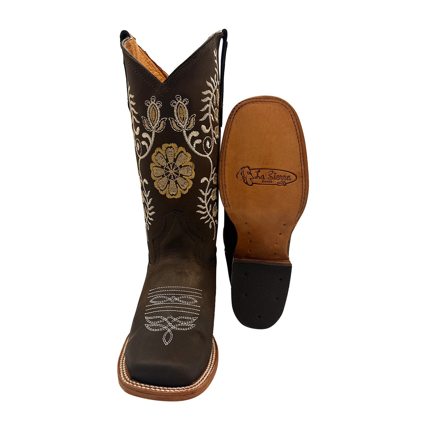 - DESIGN: Women’s brown embroidered cowgirl western boot | Beautiful and meticulous attention to detail | Embroidered with yellow, and beige toned floral stitching | Square toe